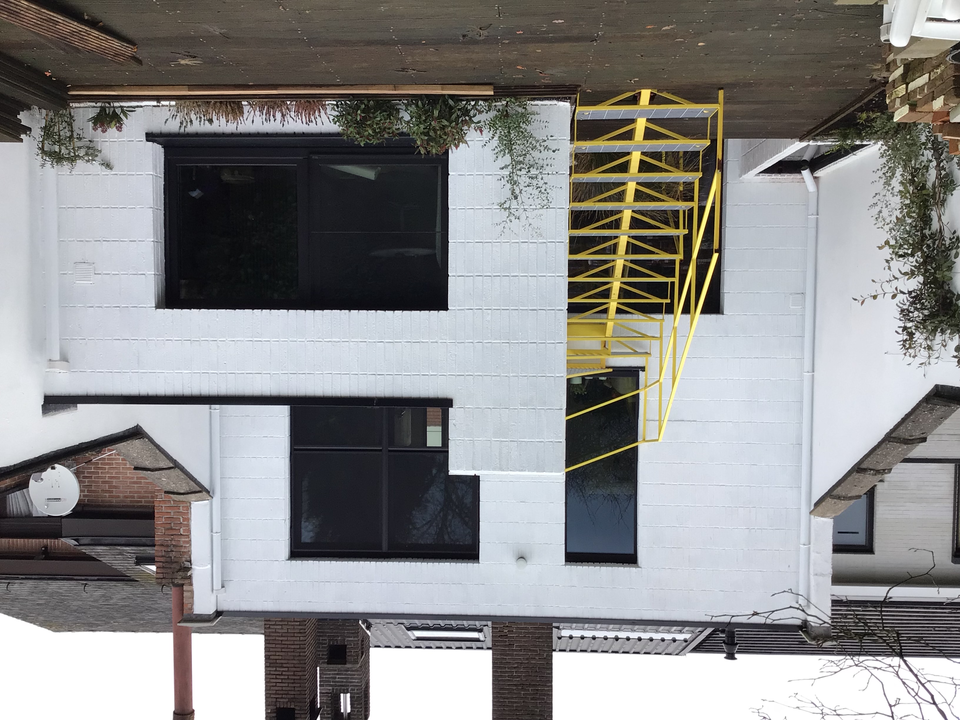 Van de bestaande garage werd achteraan een deel afgesplitst als woonruimte. Bovenop werd nog een verdieping met slaapkamer ed. opgetrokken en een zolder.